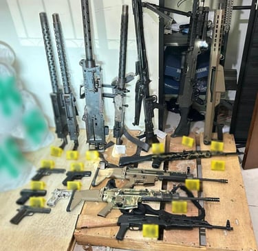 Por lo anterior, los efectivos desplegaron un dispositivo de seguridad y cumplimentaron la orden de cateo en el lugar, donde hallaron 32 armas largas, cinco armas cortas, cargadores, cartuchos, así como 80 litros y 150 kilos de sustancias ilícitas, además de equipo táctico.