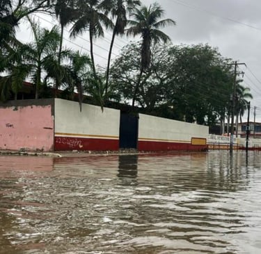 Durante la mañana de este domingo, autoridades municipales y elementos de Protección Civil realizaron un recorrido por las instalaciones del plantel, donde el agua alcanzó a cubrir el acceso principal, así como las canchas deportivas y los patios centrales.